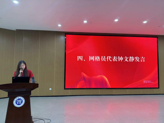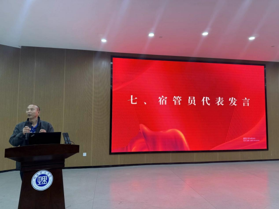 网格员合影结束后,网格员代表钟文静、寝室长代表徐亮、学习委员代表刘佳平分别从各自的职责出发,对台下的网格员、寝室长、班委发起倡议,希望大家共同努力,踏实工作,以饱满的热情和认真的态度投入到宿舍管理与学风建设中,营造一个良好的学习和生活环境。