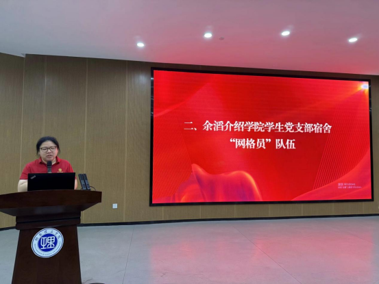 会议第二项,余滔介绍网格员队伍,指出信息学院组建四级网格员队伍旨在加强学生宿舍管理,营造安全稳定、干净整洁的学生宿舍环境和学风浓厚的氛围。详细讲解了网格员的工作职责,具体包括收集学生对寝室各方面的意见和建议,解决学生生活困难,协调寝室矛盾,负责寝室安全工作和文化建设等。