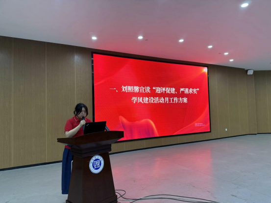 会议伊始,刘照馨宣读“迎评促建,严谨求实”学风建设活动月工作方案,方案指明了活动主题、活动目标、活动时间以及主要活动内容,并提出工作要求,以期加强学风建设,深化教育教学改革,完善质量保障体系,全面提高本科人才质量培养。