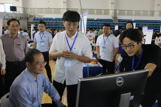 在参赛作品展示环节,湖南省教育厅副厅长葛建中来到展台前亲自体验我校参赛作品,并对学生赞赏有加,鼓励同学们继续努力。(研究生院付亚子/信息学院潘理)