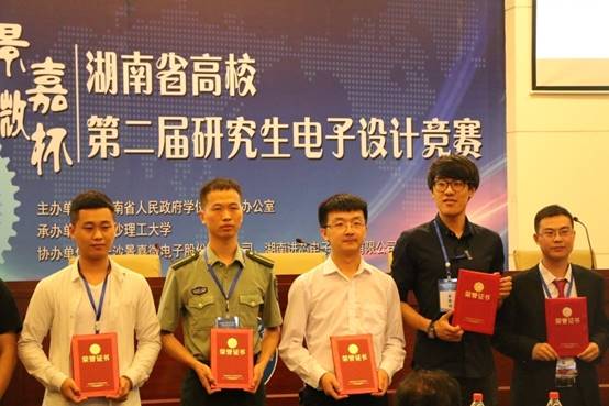6月2日,由湖南省学位办主办、长沙理工大学承办、长沙景嘉微电子股份有限公司和湖南进芯电子科技有限公司协办的湖南省第二届研究生电子设计大赛在长沙理工大学落下帷幕。我校组织的6支代表队(信息学院5支,机械学院1支)与国防科技大学、中南大学、湖南大学等14所高校的83支队伍同场竞技。经过全体人员的共同努力和顽强拼搏,最终获得一等奖和三等奖各1项,实现了研究生电子设计竞赛一等奖“零”的突破,童耀南和陈松老师荣获优秀指导老师。