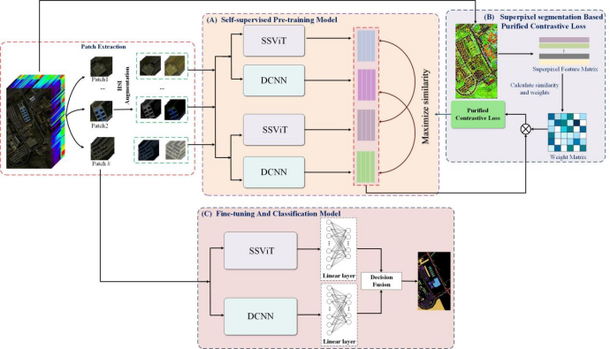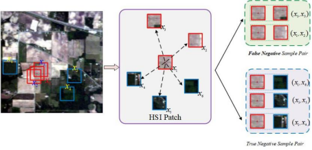 在上述研究工作的基础上,研究生李佳、罗文强继续深入探索,揭示了高光谱图像对比学习范式中存在的假负噪声样本对问题。如图2所示,在基于滑窗的高光谱图像正、负样本对构建过程中,正样本对有可能被错误划分为负样本对,从而产生假负噪声样本对。针对这一问题,提出了一种新的基于超像素图的纯化损失函数以及新型的全局-局部互补网络架构,如图3所示。相关研究成果“Purified Contrastive Learning with Global and Local Representation for Hyperspectral Image Classification”发表于中科院一区期刊《IEEE Transactions on Geoscience and Remote Sensing》。目前该工作的代码已经开源,为该领域的研究提供了好的参考与新的思路。