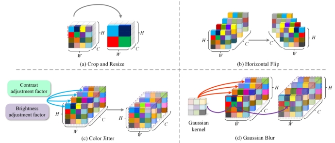 (b)水平翻转 (c)色彩抖动 (d)高斯模糊