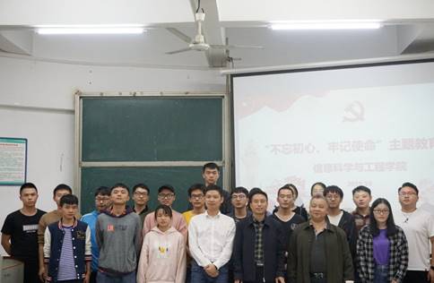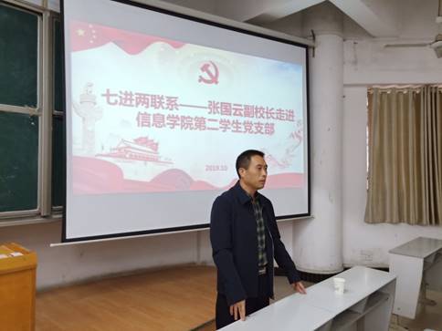 为深入贯彻落实校领导班子成员深入基层开展“七进两联系”工作,10月15日下午,副校长张国云走进信息学院第二党支部,给同学们上了一堂“不忘初心、牢记使命”主题教育课,院党总支书记甘向阳、学生第二党支部全体党员参加。