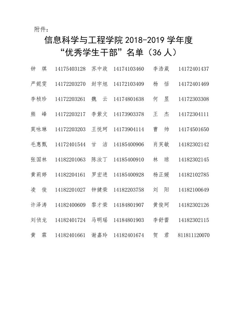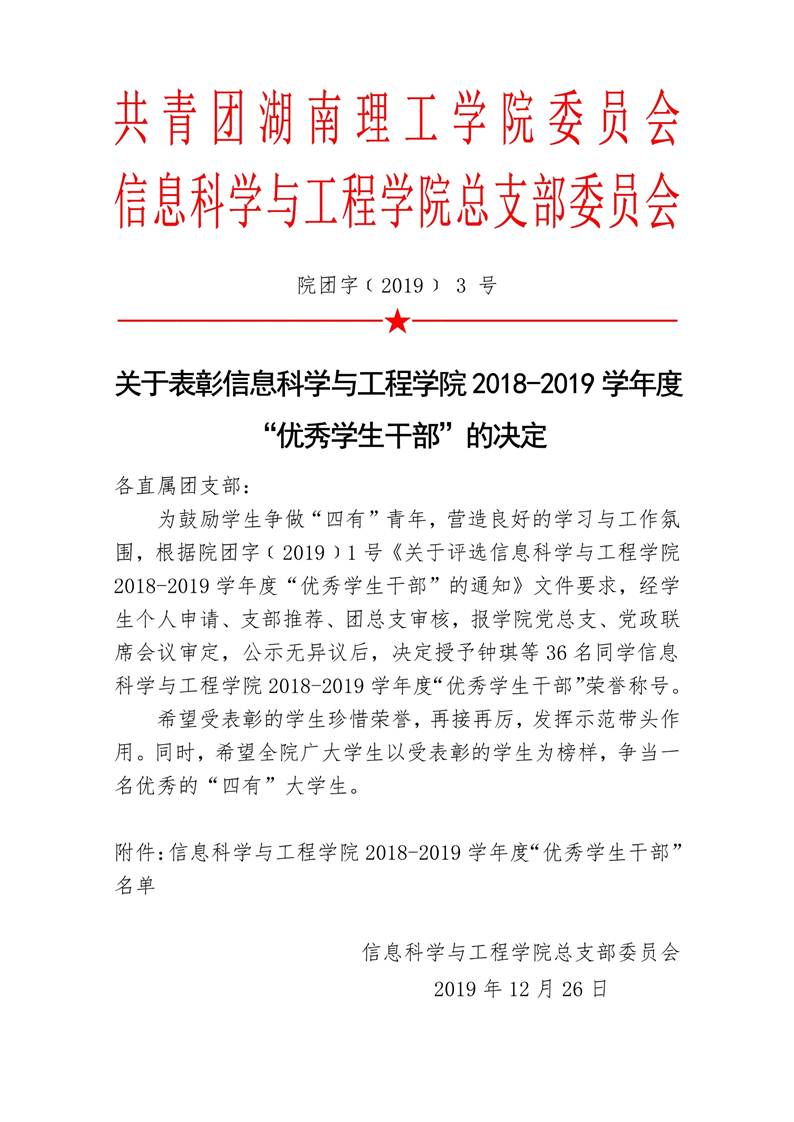 关于表彰信息科学与工程学院2018-2019学年度“优秀学生干部”评选的决定