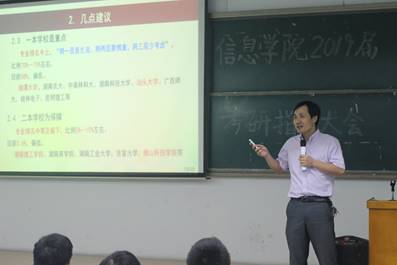 会议上,周小强首先分析了信息学院当前的考研情况及目前的考研形势。随后,他结合自身考研经验为学生传授考研秘笈。他认为,选择比努力更重要。在填报考研志愿时可供选择的院校有很多,但一定要根据自身情况慎重选择报考院校。他建议同学们可适当考虑填报211工程院校,而对于985高校要慎重考虑,并以信息学院往届毕业生申巧巧、陈敏等优秀同学考取心仪研究生院校为例,再一次强调了选择考研学校的重要性。他个人认为,志愿填报的总体原则是以一本学校为主,同时备选二本学校作为保障。