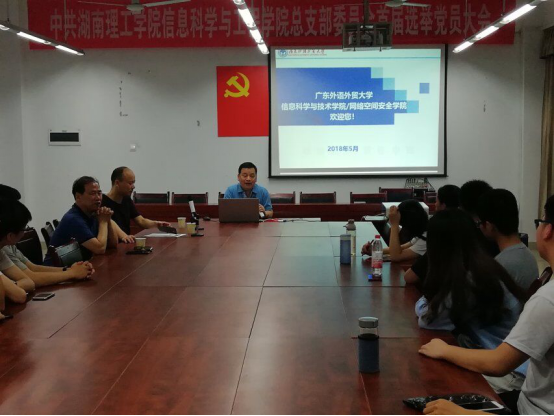 2018年5月17日晚7点,广东外语外贸大学语言工程与计算重点实验室主任李心广博士莅临信息科学与工程学院,为学院做2019年广外大学硕士研究生招生宣讲介绍。大会由学院党总支书记张泰来主持,物电学院光学研究所所长陈敏教授、考研专干许邕子出席,15级25名学生代表参与聆听本次宣讲会。
