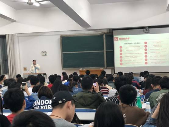 徐照青从“十九大报告的重要意义及地位”、“十九大报告全文学习”、“新时代、新使命、新思想、新征程”三个部分对党的精神与青年学生责任感进行强调。她结合中国共产党十九大“不忘初心,牢记使命”的主题,动员在座学生高举中国特色社会主义伟大旗帜,脚踏实地地为实现民族伟大复兴的中国梦不懈奋斗。