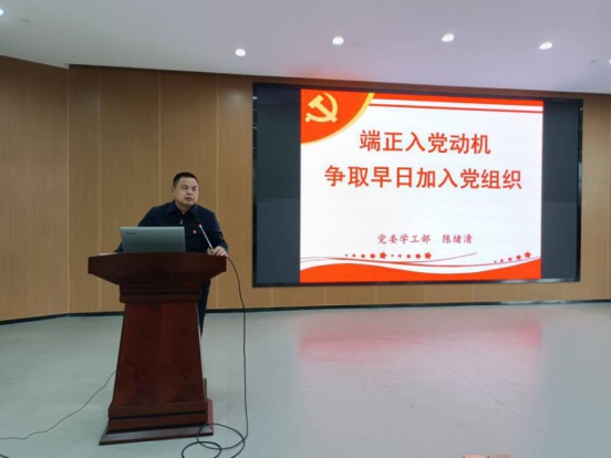 陈绪清从三个方面对“端正入党动机,争取早日入党”进行了生动阐述。一是端正入党动机的重要性,二是端正入党动机的基本要求,三是以实际行动争取早日加入党组织。随后他引用习近平总书记在中国人民大学考察时的重要讲话,希望所有入党积极分子不负韶华,不负时代,不负人民,在青春的赛道上收获成长与快乐。