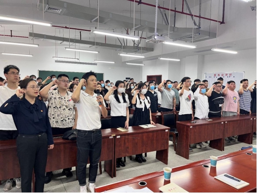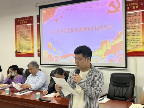 大会开始,全体毕业生党员在激昂的国歌声中肃立合唱国歌,王学鹏带领大家重温入党誓词。随后,18级优秀毕业生党员代表周承乐发言,他表示:“一名党员就是一面旗帜,要勇于发挥党员的先锋模范作用,积极带动身边的人一起为祖国的未来而奋斗。