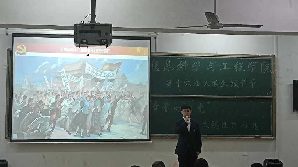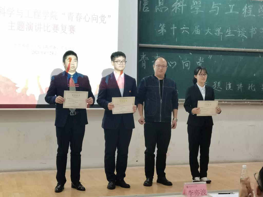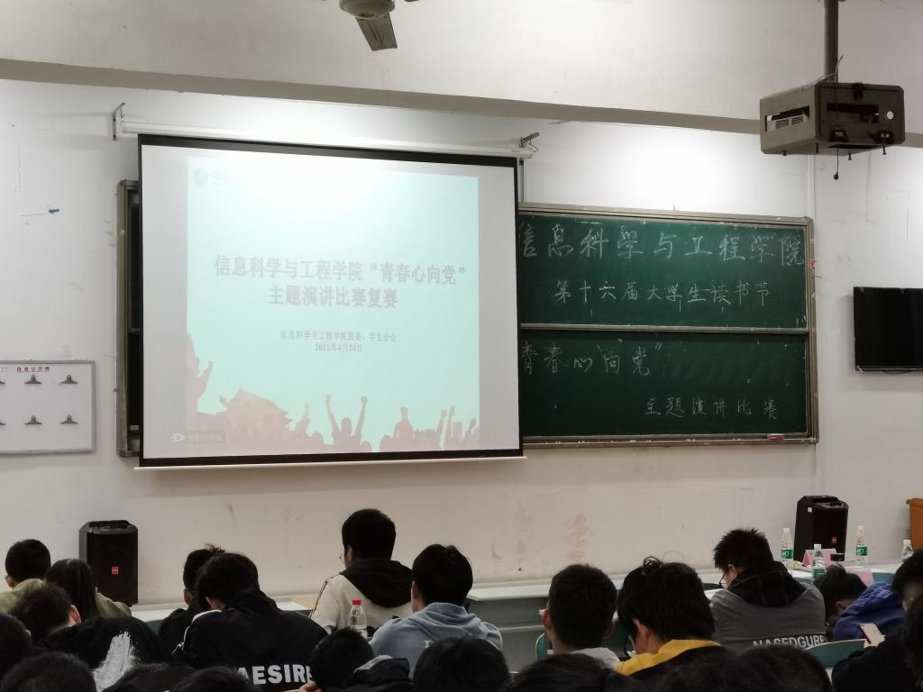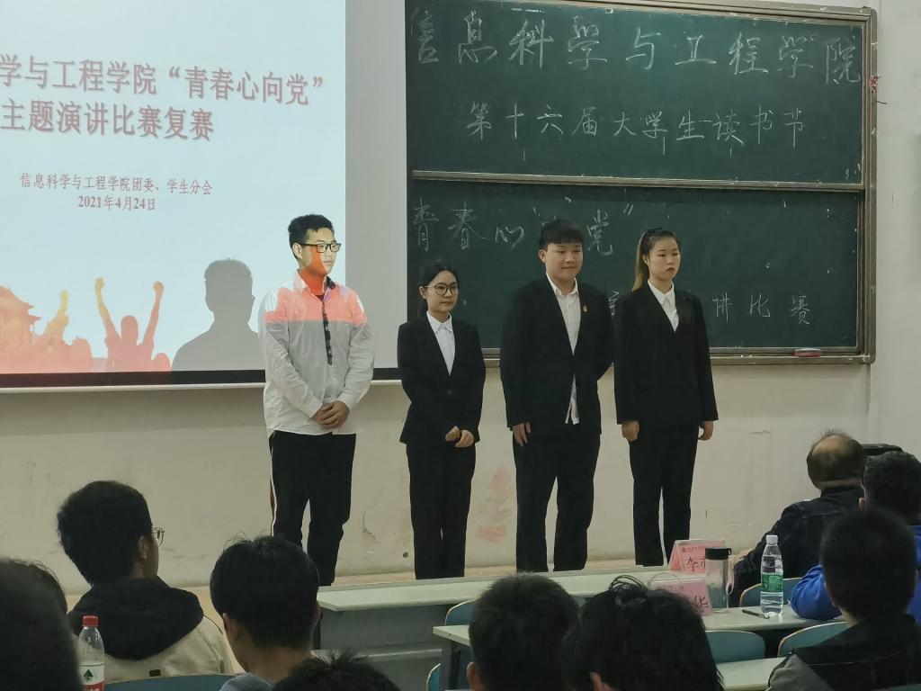 4月24日19:00,信息学院“青春心向党”主题演讲比赛复赛在9T1举行。院党委副书记徐丹、18级辅导员李亦波,院团学分会主席团成员李丝语、顾琦华、黄丽婷、刘烨荣担任评委,文娱女生部刘霞主持。