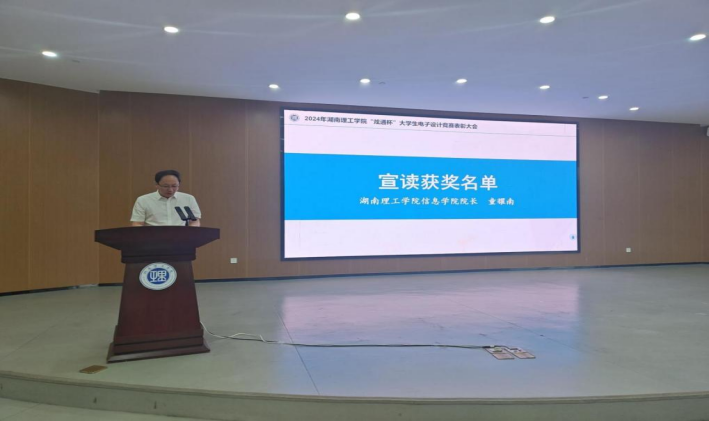 信息学院院长童耀南宣读获奖学生名单。本次比赛共有56支队伍,126人获奖,其中一等奖26人,二等奖31人,三等奖46人,优胜奖23人(制作类三等奖),获奖人数占参赛人数46.7%。