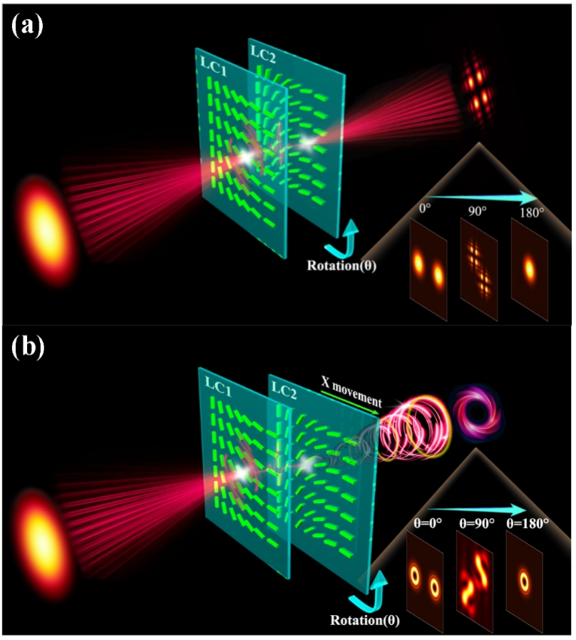 本研究利用两片相同的平面化液晶器件级联,避免了复杂的设计以及高昂的成本,同时也保留了平面液晶器件原有的体积紧凑、即插即用的优势,实现了多种典型结构光的可重构生成和光子自旋霍尔效应动态调控: