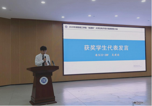 获奖学生代表吴建南发言,分享从“‘科创小白’到‘获奖选手’”的历程。他感谢广州炫通电气科技有限公司搭建的专业平台,感谢学校对学科竞赛的高度重视,感谢学院提供的实践平台,感恩指导老师在技术攻关、心态调整中的陪伴,号召同学们以竞赛为契机,走出“舒适区”,用技术创新回应时代需求,让青春在科创实践中闪光。