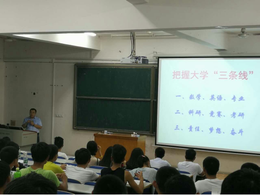 副教授程望斌就学生如何实现“大学三线”内容做出详细解读。“三线”即专业线、考研线与个人发展线。他指出,实现“三线”,理解专业要求是前提,把握好中心任务是关键,科学规划大学学习是重要内容。他要求学生认真积累专业学习经验,积极投身各类学科竞赛,为大学生活留下浓墨重彩的一笔。