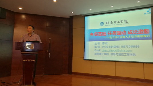为深化我院人才培养模式改革,加强与省内兄弟院校在学生创新创业教育方面的交流,5月12日,学院电子设计竞赛相关负责人、指导教师代表赴长沙参加了2017年全国大学生电子设计竞赛湖南赛区研讨会。会上,陈松老师应主办方邀请,作了《电子设计竞赛人才培养机制探讨》的专题报告。