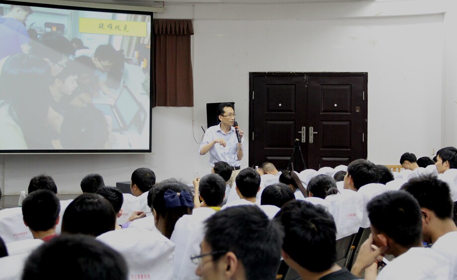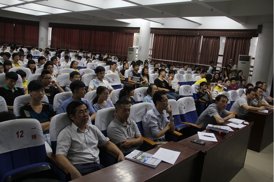 (校园通讯)2014年6月26日,信息学院2011级工程实训产品验收汇报会在南院六栋学术报告厅成功举办。出席此次汇报会的学院领导有徐四星书记、丁跃浇副院长、李武副院长、欧阳竟成主任,以及指导老师吴健辉、陈松、刘翔、湛腾西、杨宣兵等。学院2012级和2013级200余名学生全程观摩学习。汇报会由吴健辉老师主持。