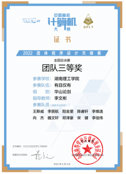 本次竞赛以线上形式开展,来自北京大学、浙江大学、国防科技大学等430所高校的1429个团队14290余人同场竞技。经过3小时的激烈角逐,由信息学院和数学学院李居航、阳金里、王斯威、陈睿轩、魏文轩、向杰、李维逸、郑泽豪、宋健和李佳伟等10位同学组成的“有且仅有”团队荣获铜牌,李文彬、杨勃博士等为指导老师。本次学生参赛并取得喜人成绩,是近年来信息学院以“三全育人”为理念,多措并举,不断加强计算机科学与技术国家级一流本科专业、软件工程湖南省一流本科专业建设的阶段性成果。