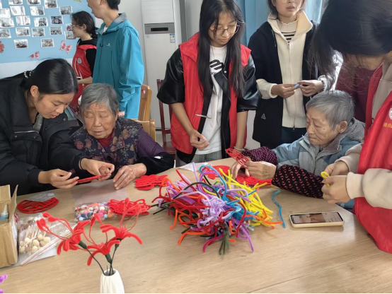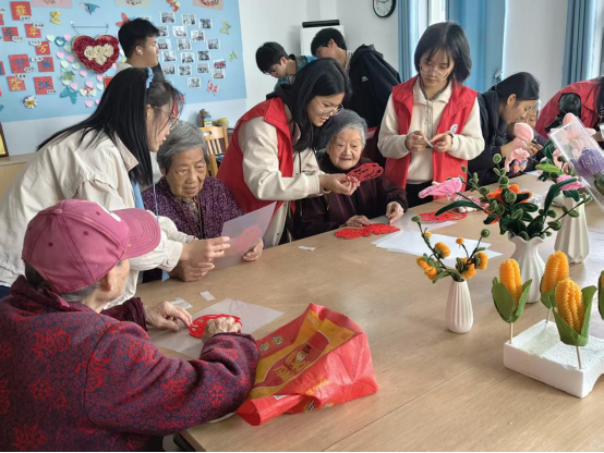 到达敬老院后,志愿者们迅速行动起来,与老人们亲切地交谈。随后,志愿者们开始分工协作,有的教老人贴窗花,有的教老人用扭扭棒做出美丽的花朵,还有的协助老人们完成他们自己的绘画作品。活动现场充满了欢声笑语,老人们的脸上也都洋溢着开心和幸福的笑容。