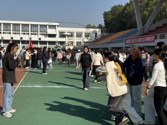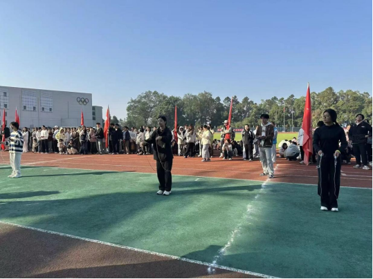 比赛现场彩旗招展,各学院队伍有序候场。随着裁判哨声响起,信息学院代表队迅速进入状态,摇绳的两名队员手臂摆动幅度均匀,长绳划出的弧线稳定而有力;跳绳队员们则以紧凑的节奏依次跃入绳中,脚步与绳拍精准契合,整套动作流畅连贯。连续跳跃的流畅表现多次引发场边观众的欢呼与掌声。选手们凭借扎实的训练基础与临场的稳定发挥,在多支队伍中脱颖而出。