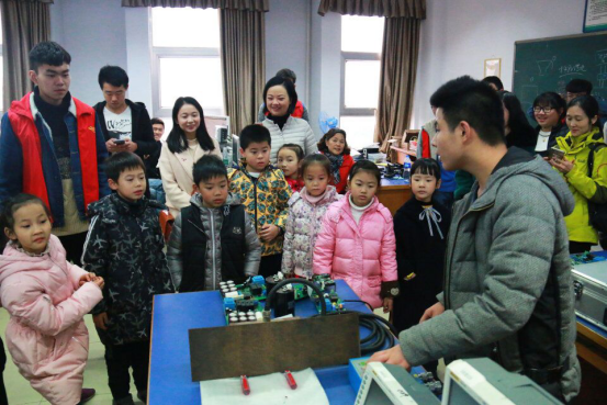 科普活动过程中,讲解员裘寒冰首先带领小朋友参观16栋逸夫楼三楼电子产品展区,介绍各类电子元件及近年来的学术科研作品成果。随后,她带领儿童进入信息学院陈松老师指导的创新基地,在实验室学生刘良振的仔细讲解及对电子类产品的使用演示下,小朋友们亲自着手操控,在交流互动过程中让孩子们近一步走进科学的世界。