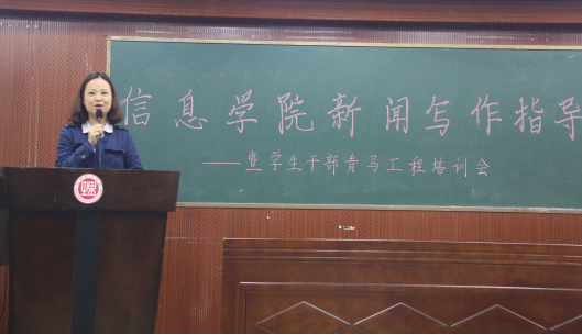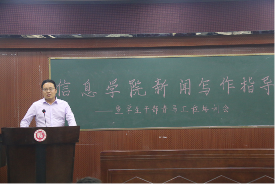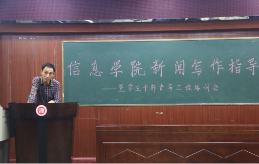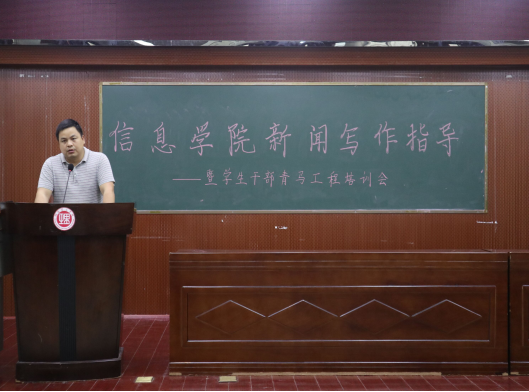 为增强学生人文修养、提升学生表达能力,进一步提高学生综合素质,2017年5月23日下午3点,信息学院于6栋学术报告厅举办新闻写作指导暨学生干部青马工程培训会。校党委宣传部陈绪清副部长、司念伟老师应邀出席指导工作,信息学院院长李武、党总支书记张泰来等教师代表及15、16级部分学生代表参加培训会。本次培训会由信息学院党总支副书记徐丹主持。