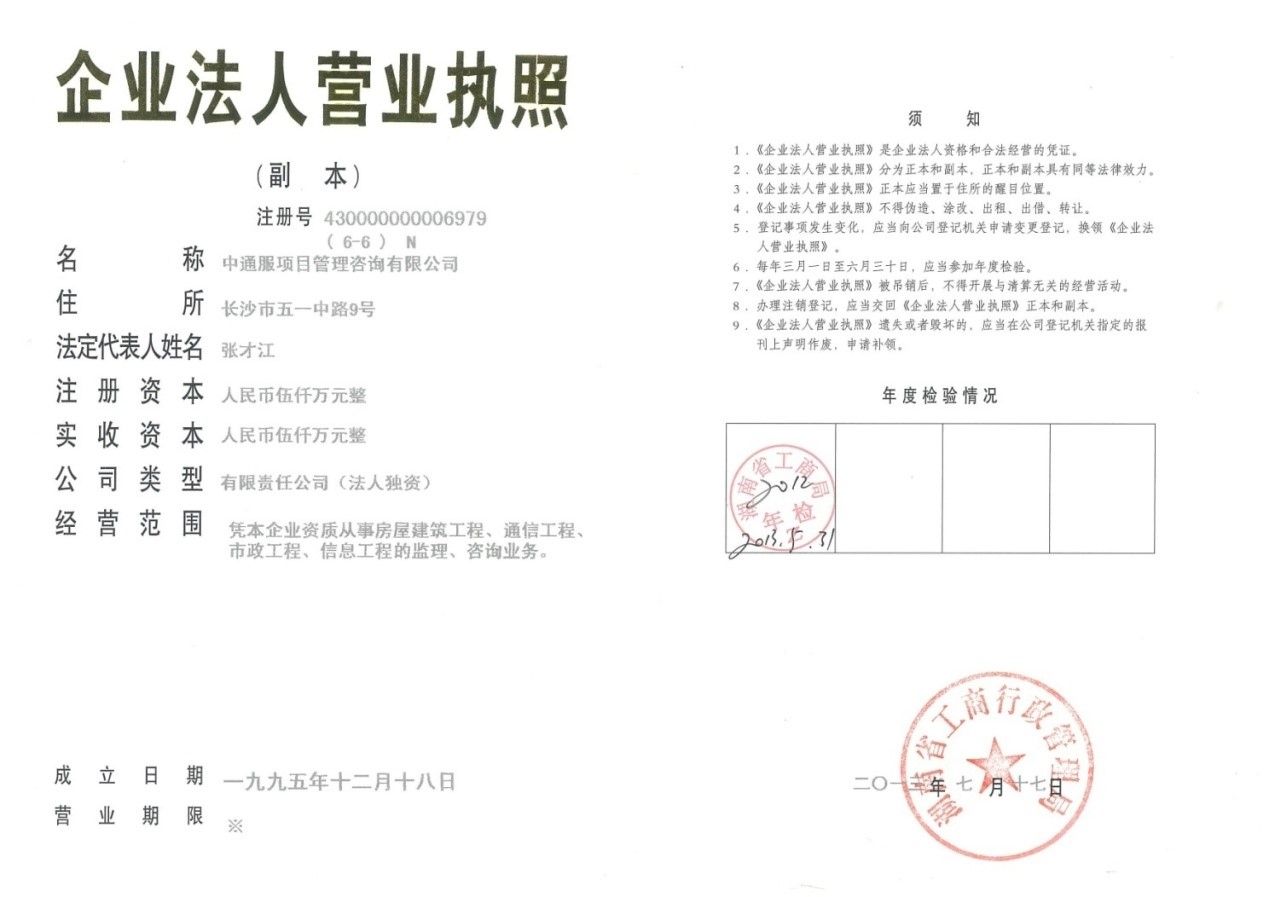 中通服项目管理咨询有限公司成立于1995年,是国内通信行业工程建设领域应市场化和规范化运作需求而较早成立的监理企业,是中国通信服务股份有限公司下属的具有独立法人资格的监理单位,注册资金5000万元。公司于2002年经国家建设部批准为甲级建筑监理单位、经原国家信息产业部批准为甲级通信监理单位,于2005年12月经原国家建设部批准为甲级市政公用工程监理单位,并于2006年9月取得了国家商务部批准的对外承包工程经营资质,成为国内具有相当实力的“三甲”资质监理企业。