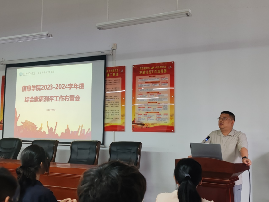9月10日12:30,信息学院2023-2024学年度综合素质测评工作布置会在17503举行。院党委副书记付亚子及各年级辅导员出席本次会议,各班班长、团支书、学习委员参加。本次会议由陶海兰主持。
