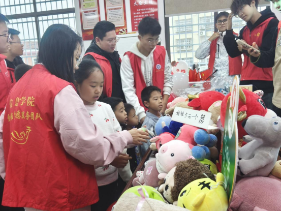活动伊始,志愿者们在义卖摊位上摆满了各式各样的商品,包括玩偶,自制手工艺品以及各类玩具等。少年儿童们在信息学院志愿者的引导下,踊跃参与到了义卖活动中。