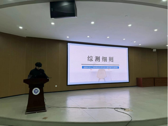 学习部胡先勇详细讲解了学生综测细则,帮助同学们清晰了解综合测评的各项指标与加分减分规则,激励大家全面发展,积极参与各类活动与学术竞赛,提升自身综合素质。