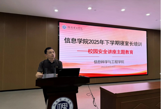 信息科学与工程学院为了进一步夯实平安校园工作,有效开展学生安全教育管理工作,于本学期开学第一周制定了定期寝室长培训方案,并于9月16日下午在17118开展了第一次培训暨校园安全讲座主题教育活动。此次培训特邀请了信息中心专家对全体寝室长进行校园网络安全防范培训,信息中心申丽平老师主讲,学院党委副书记潘昕、信息中心副主任黄为出席参加此次培训,本次培训由24级辅导员王艳芬主持,22级、23级、24级全体寝室长、班长、院学生会生活安全委员参会。