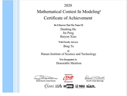 第一次担当“主心骨”,又碰上特殊时期,压力和担子都落在了她的肩上,但何丹冰选择把它扛下来。她提前统筹谋划,安排好比赛进度,协调好队员之间的合作与分工,确保线上沟通的有效率。从3月6日早晨6点开始,在长达4天4夜的时间里,他们以语音通话和视频会议等方式实现讨论和协调,从赛题选择、模型构建、算法设计、程序实现、数据分析总结、论文撰写等各个环节,项目进度丝毫没有受到影响。最终,在今年的美国大学生数学建模比赛中,何丹冰和她的小组取得了国际二等奖的优异成绩。