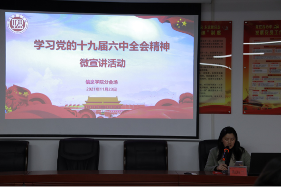 为有效推动我校大学生学习宣传贯彻习近平新时代中国特色社会主义思想和党的十九届六中全会精神,深入推进大学生思想政治教育工作,切实把思想和行动统一到党的十九届六中全会精神上来,促进大学生成长成才,11月23日19:00,信息学院组织观看“604学理论示范寝室送理论进寝室微宣讲活动”线上直播,各年级党员、学生干部、寝室长代表参会。