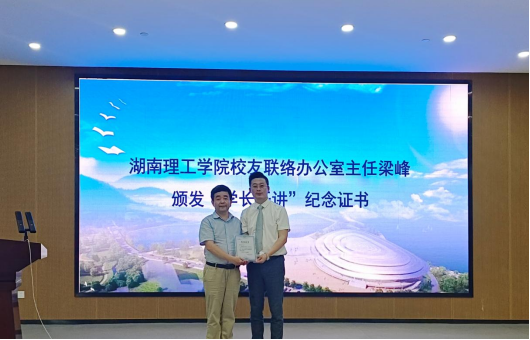 讲座结束甘向阳、梁峰分别代表学校赠送马世超校友订制礼品并颁发“学长开讲”纪念证。