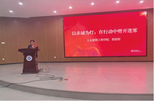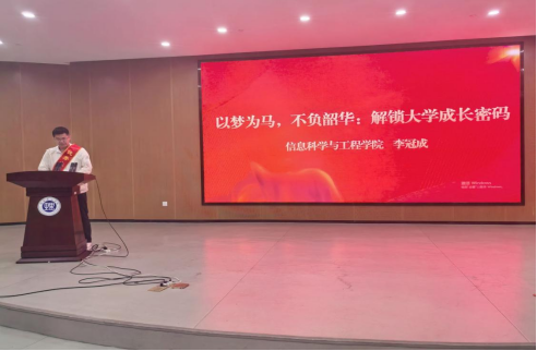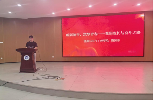 四位优秀学子依次登台分享成长经验。能电学院谢湘泰以"砥砺前行,筑梦青春"为题,讲述通过AI工具应用、科创竞赛实现专业突破的经历,强调"资源筛选+自主学习"双轮驱动的成长法则。经管学院朱格妍通过"通关秘籍与掉坑日记"的鲜活叙事,展现如何以专业为锚点,在学科竞赛中实现认知跃升,提出"知识应用、团队协作、坚持笃行"的成长三要素。土建学院郭思妤以"以赤诚为灯"为主题,分享历史建筑保护专业学习中的坚守与突破,结合支教经历诠释"专业价值与社会责任"的深度融合。信息学院李冠成通过"解锁大学成长密码"的实践指南,系统梳理目标管理、能力提升的进阶路径。