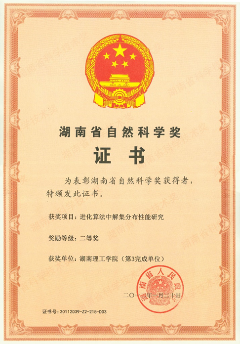 事件简介:我院首次获得湖南自然科学二等奖,有效支撑了信息与通信工程一级学科硕士点的建设,证明了我院的科研能力得到了提升,提高了学院在智能优化与处理方向的学术地位。