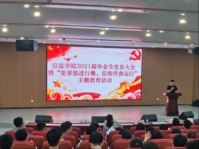 5月28日16:00,信息学院2021届毕业生党员大会暨“党章装进行囊,信仰伴我远行”主题教育活动在17栋报告厅举行。院党委书记甘向阳、党委副书记徐丹、学生支部书记周煊阳、余滔出席,2021届全体毕业生党员参加,会议由学生第三党支部书记王学鹏主持。