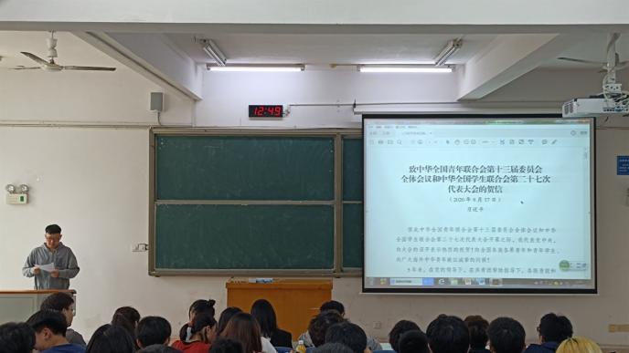 李丝语在会上宣读《关于学联学生会工作人员改进作风、服务同学的若干规定》及“我为青年做实事”活动倡议书,并分享个人体会。她提到“我为青年做实事”就是要坚持“从学生中来、到学生中去”原则。