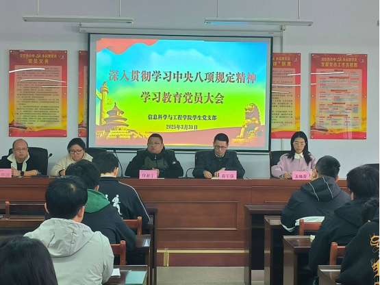 为深入贯彻学习中央八项规定精神,进一步强化党员的纪律意识与作风建设,3月31日11:50,信息学院于17503召开深入贯彻学习中央八项规定精神学习教育党员大会,院党委副书记付亚子、副院长蒋军强、学生第二党支部书记余滔、学生第三党支部书记李亦波、学生第一党支部书记王艳芬出席会议,全体党员学生参会,会议由王艳芬主持。